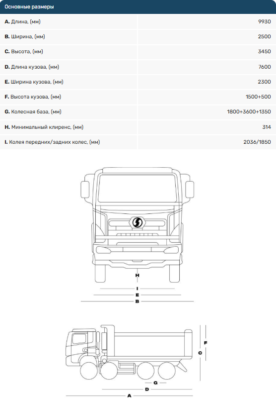Собственная снаряженная масса самосвала — 19 500 кг. Длина всего транспортного средства — 9930 мм (из них кузова 7600 мм), ширина кабины 2500 мм, кузова — 2300 мм, высота кабины 3450 мм, кузова — 1500 + 500 мм. Самосвал может развивать скорость до 90 км/ч.