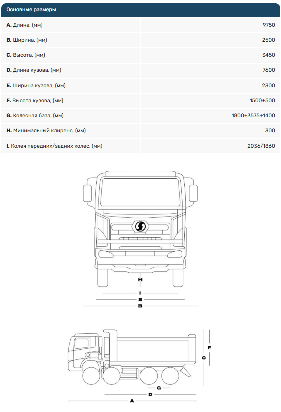 Собственный вес самосвала в снаряженном состоянии — 19 500 кг. Размеры следующие: длина 9750 мм (из них кузов 7600 мм), ширина кабины 2500 мм, ширина кузова 2300 мм, высота кабины 3450 мм, высота кузова 1500 + 500 мм.